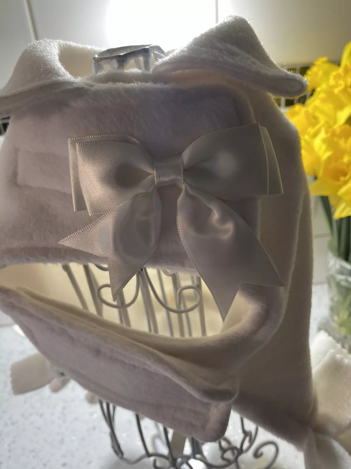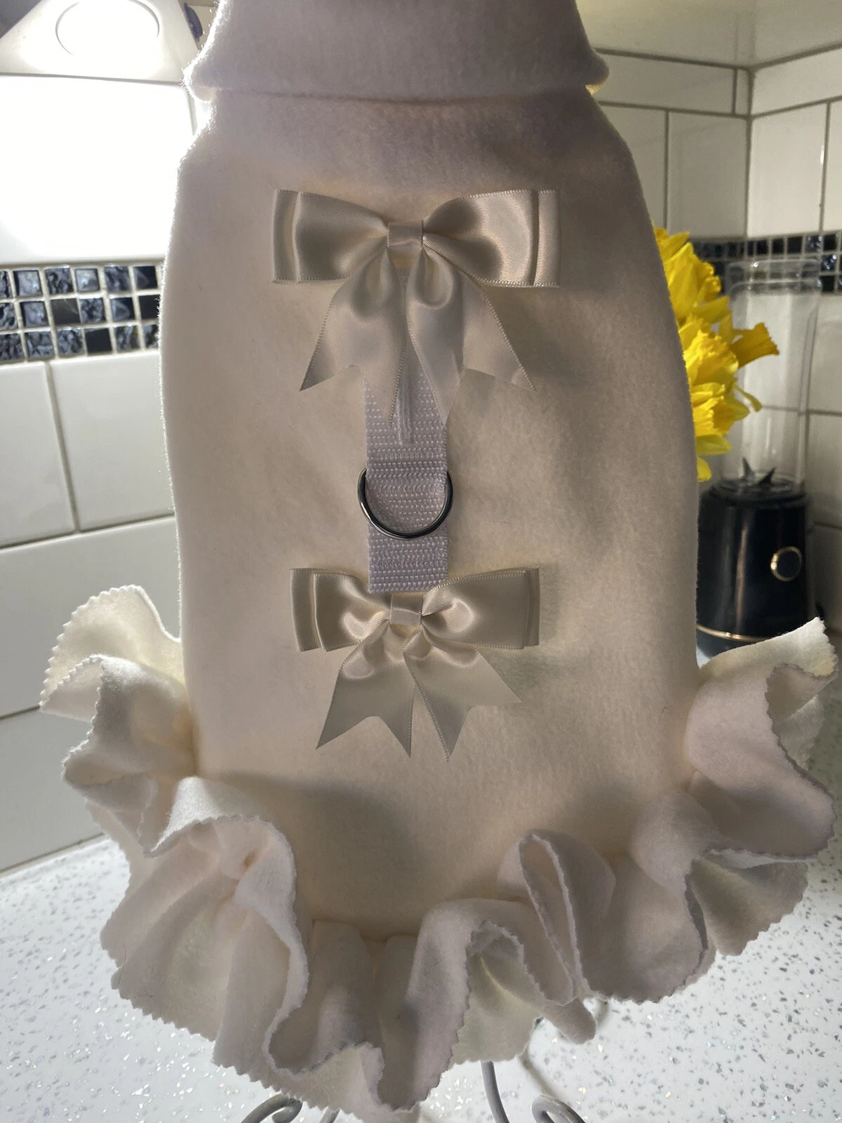 This coat is made from cream polar fleece, fully lined, and finished with a fleece frill and satin bows to make your pet stand out from the pack.